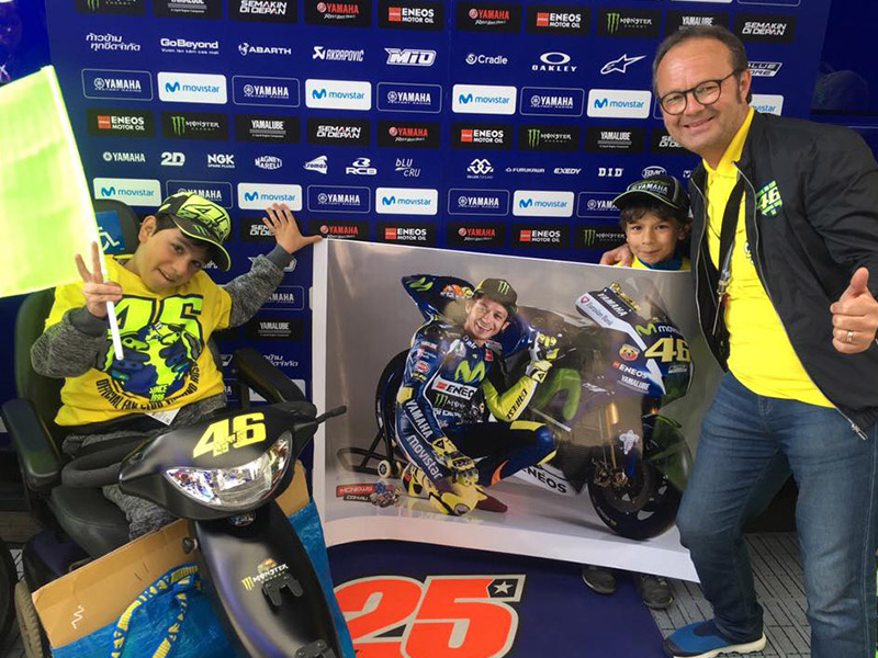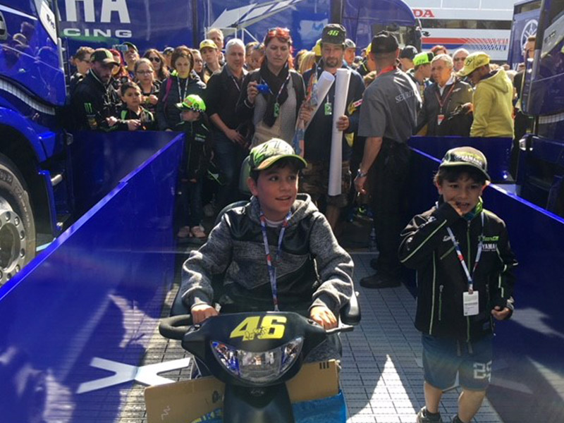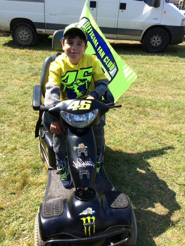 Milan souhaitait aller au grand prix de France Moto pour rencontrer Valentino Rossi son pilote moto favori. Il lui a signé un autographe sur le devant de son fauteuil motorisé ! Grâce à l’association cela a été possible le 18 mai 2018